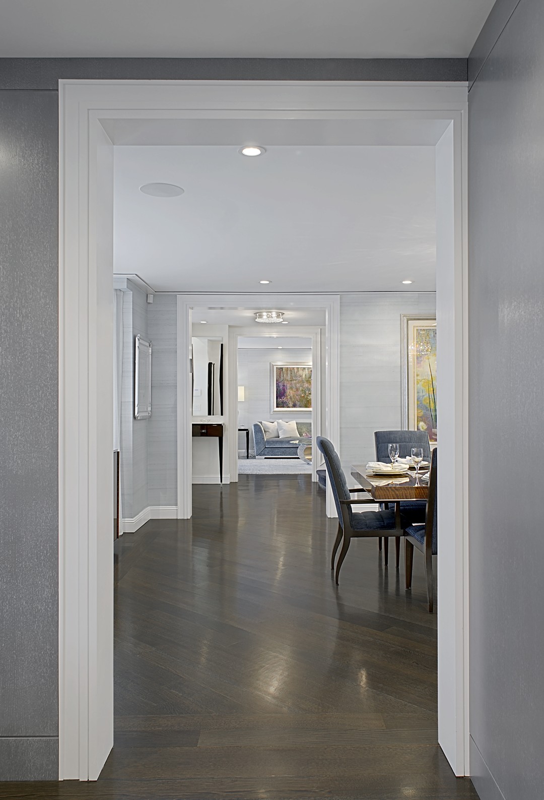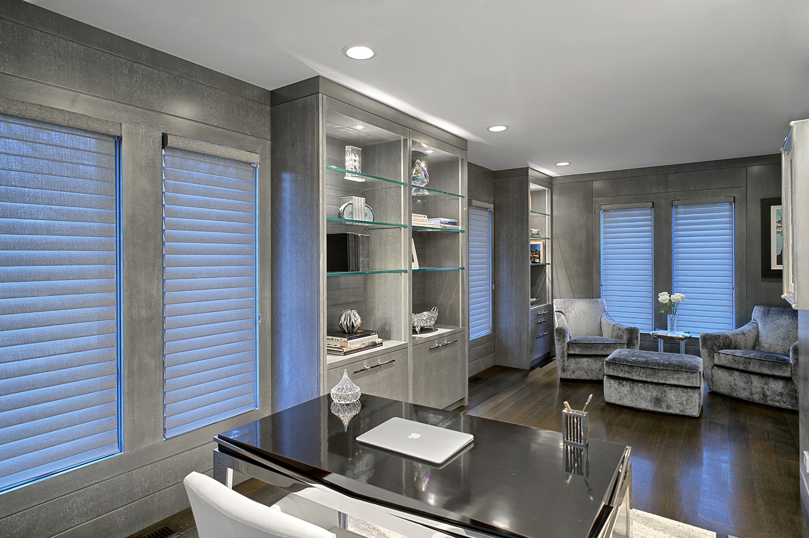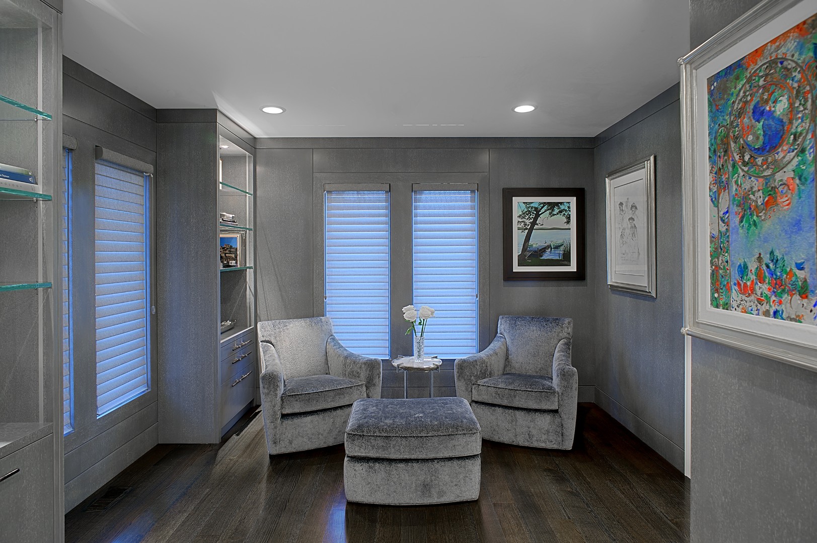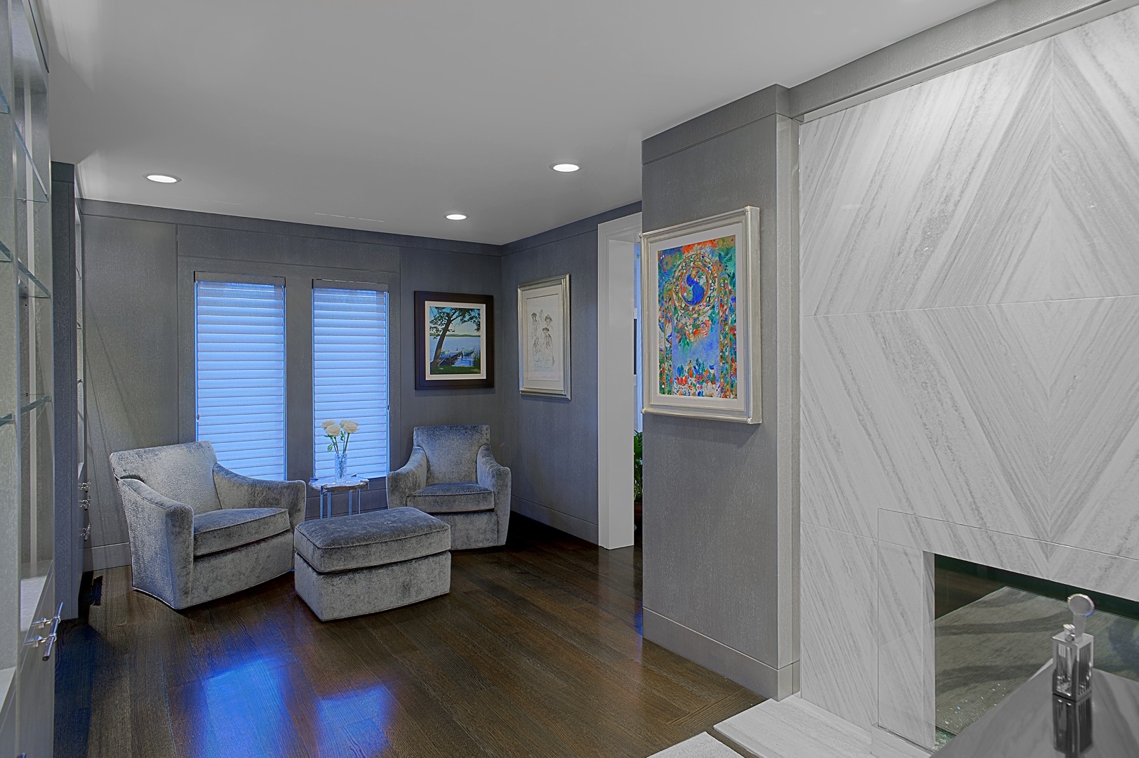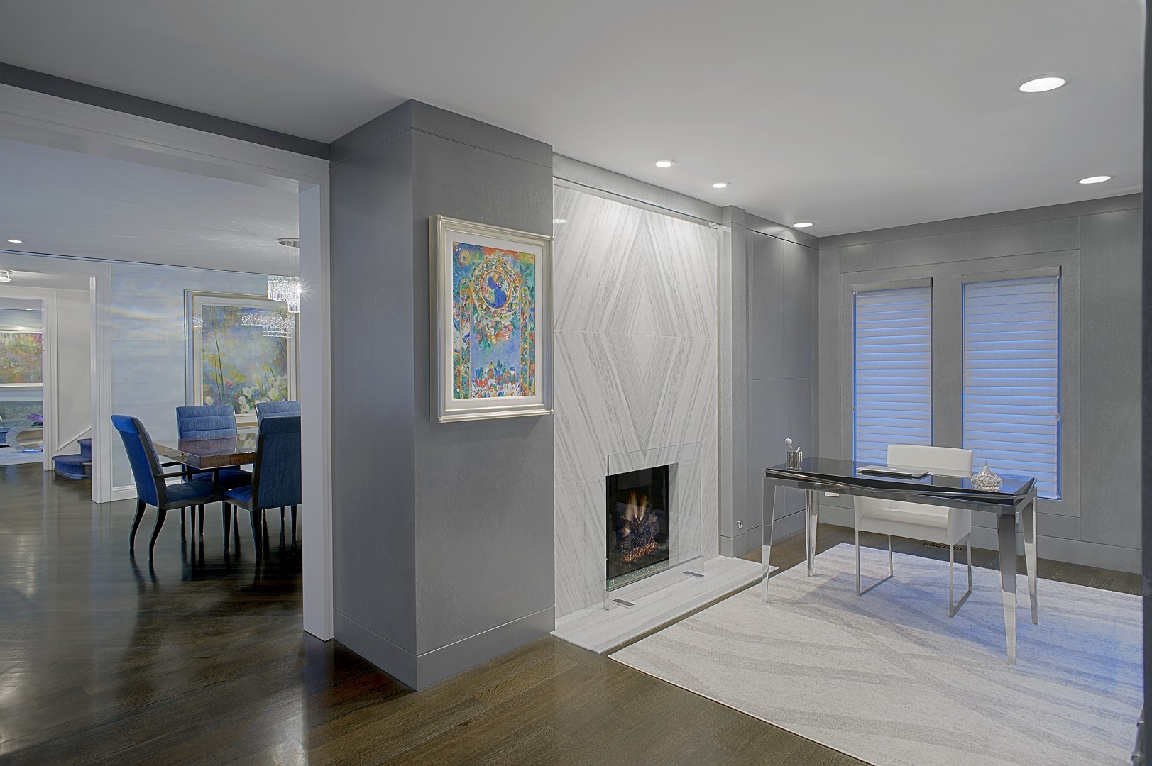 Inspired by the clients’ art collection, discerning eye, and appreciation for thoughtful design, the team reimagined the residence from the ground up. The home was fully gutted and architecturally refined to highlight a rich palette of luxurious materials, including raw silk wall coverings, silver-leaf finishes, and sumptuous exotic woods layered throughout.