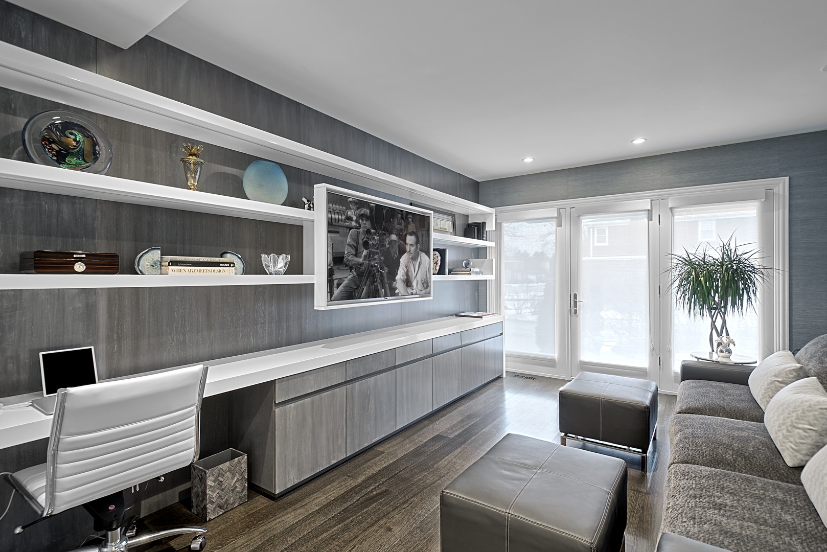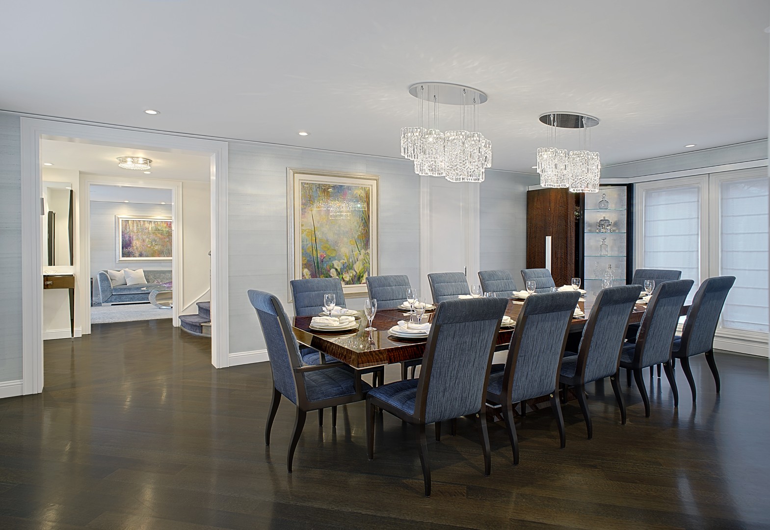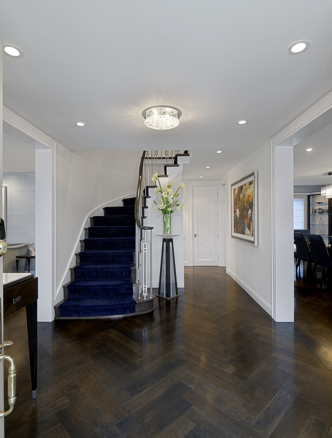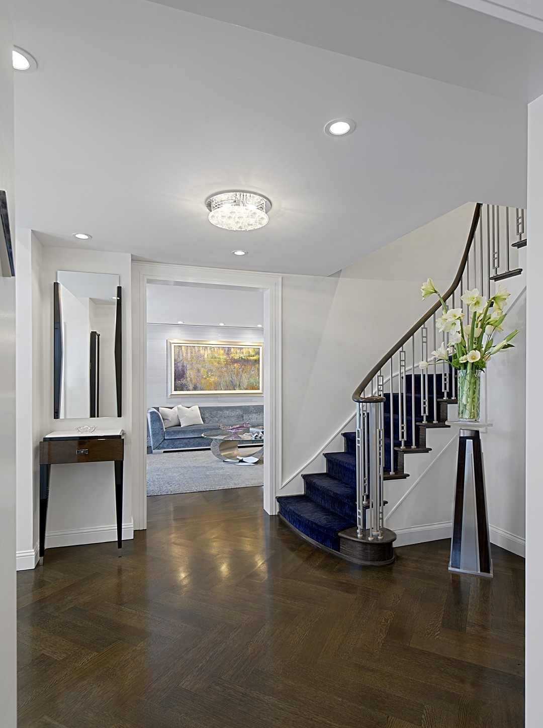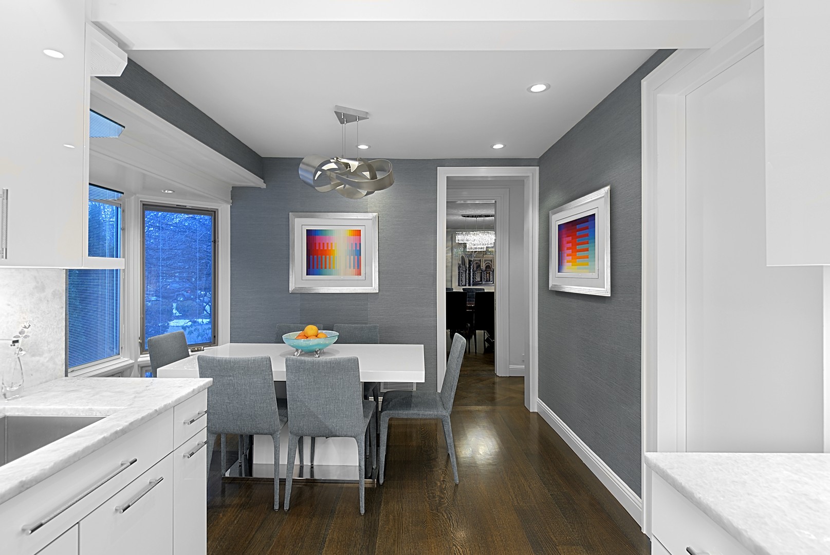 Inspired by the clients’ art collection, discerning eye, and appreciation for thoughtful design, the team reimagined the residence from the ground up. The home was fully gutted and architecturally refined to highlight a rich palette of luxurious materials, including raw silk wall coverings, silver-leaf finishes, and sumptuous exotic woods layered throughout.