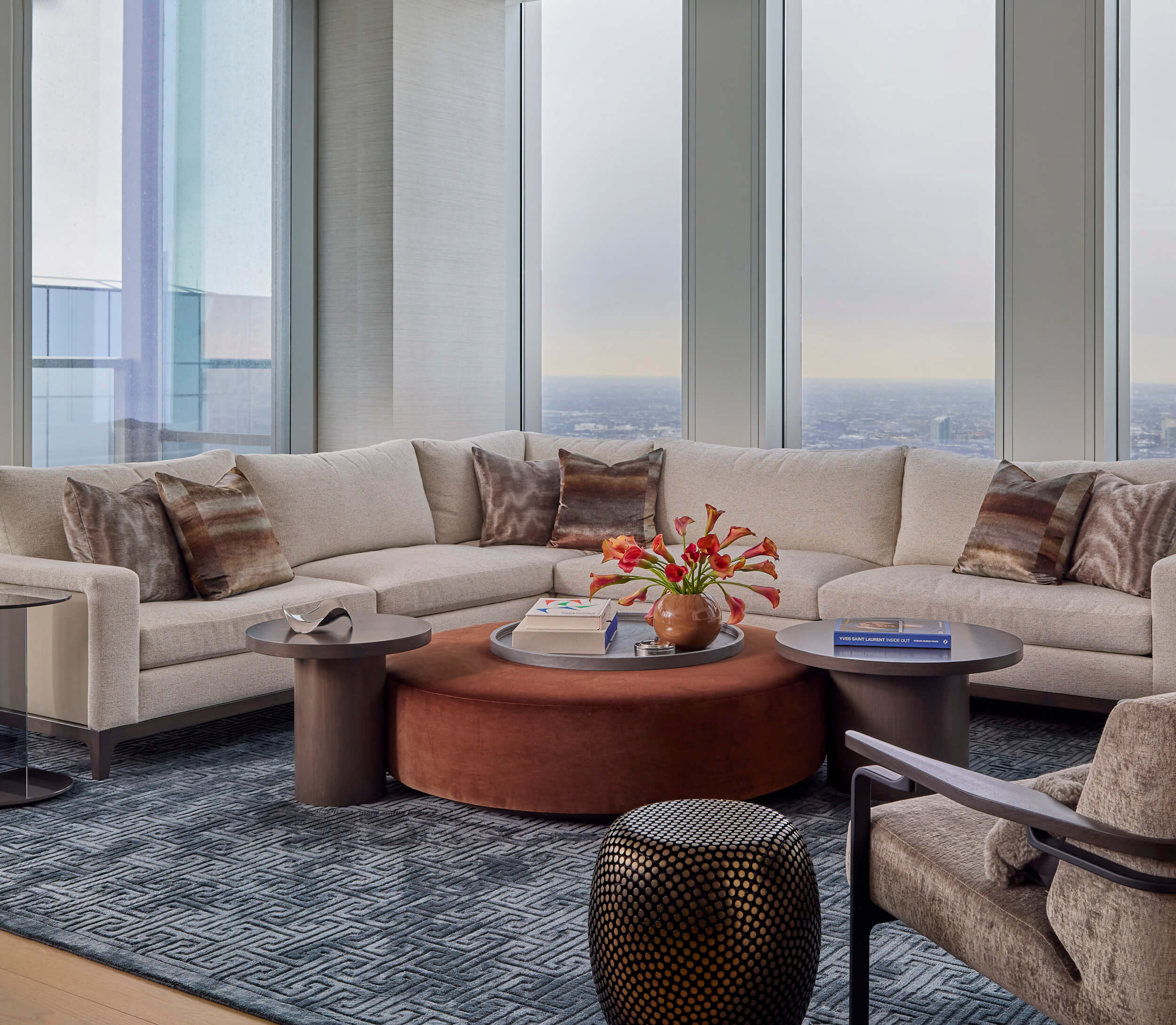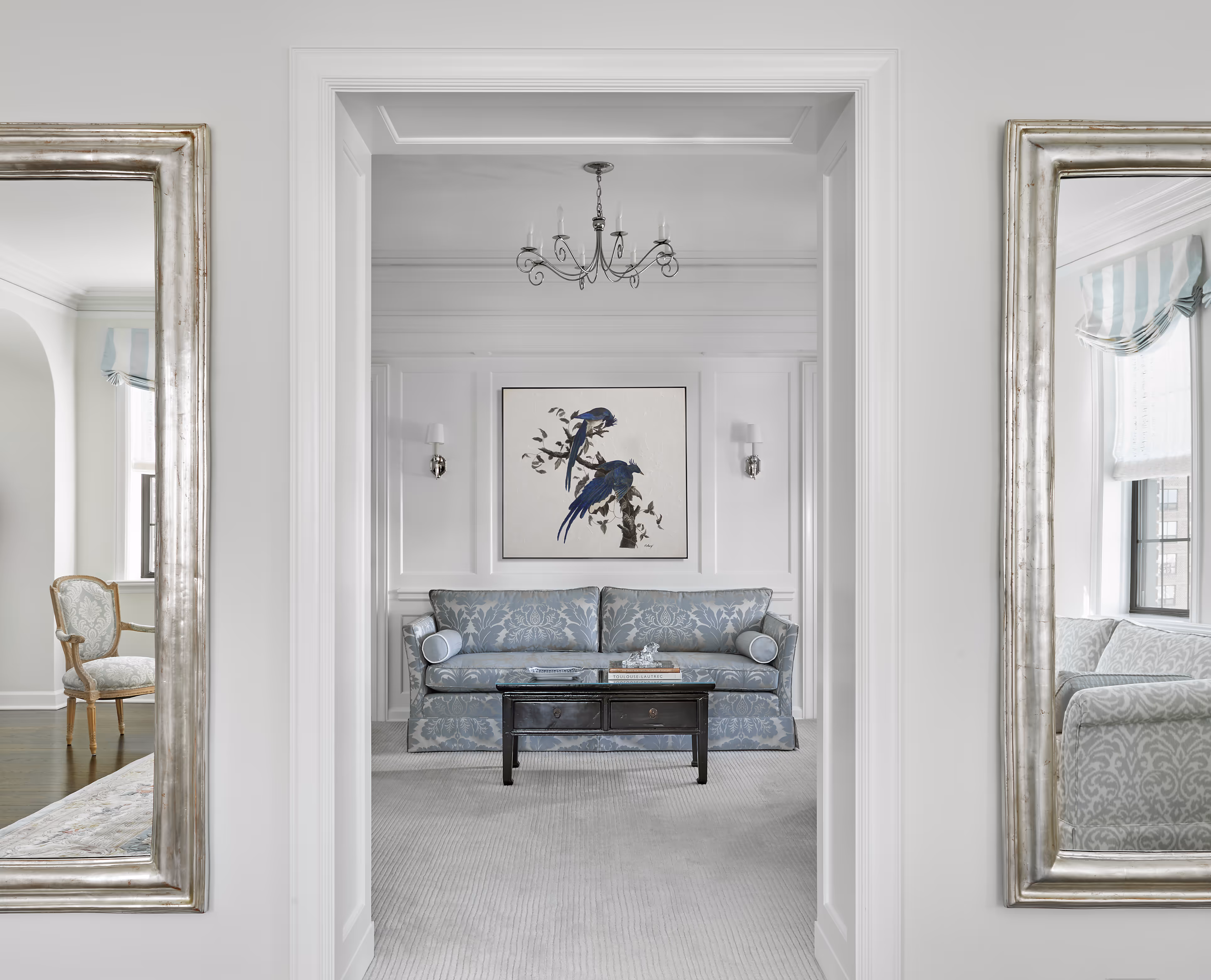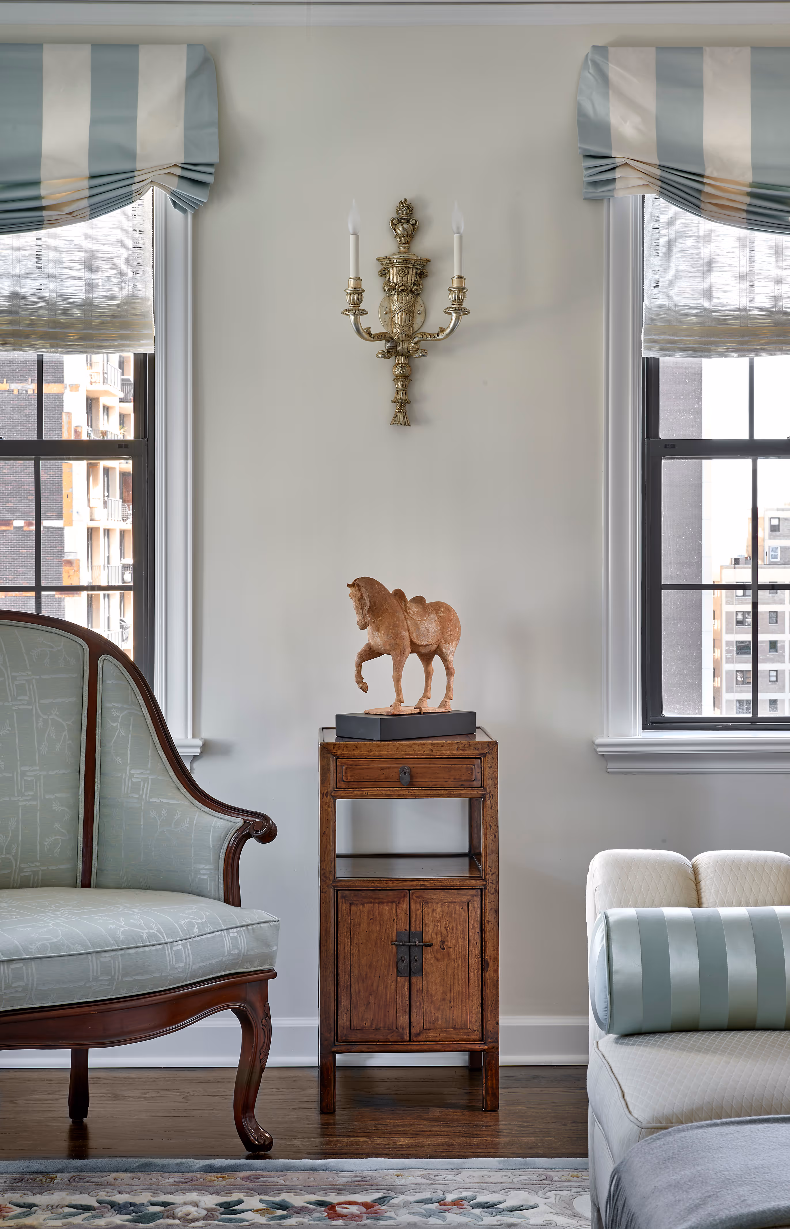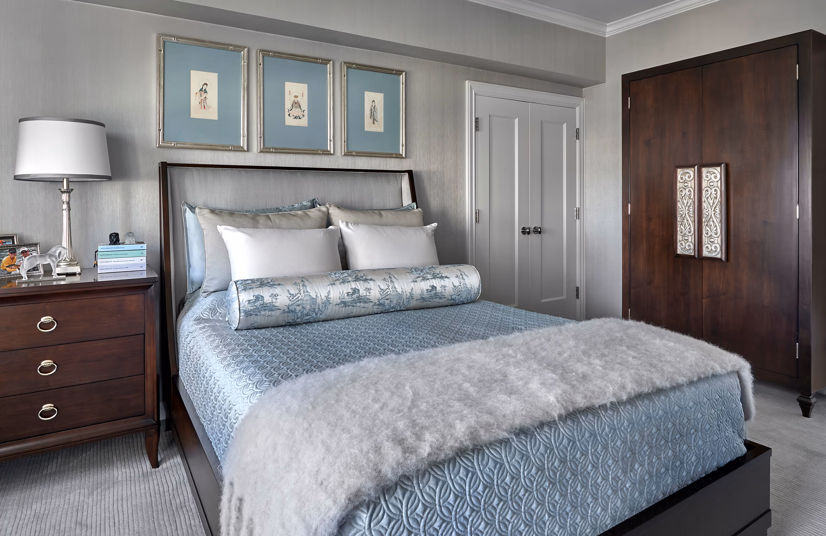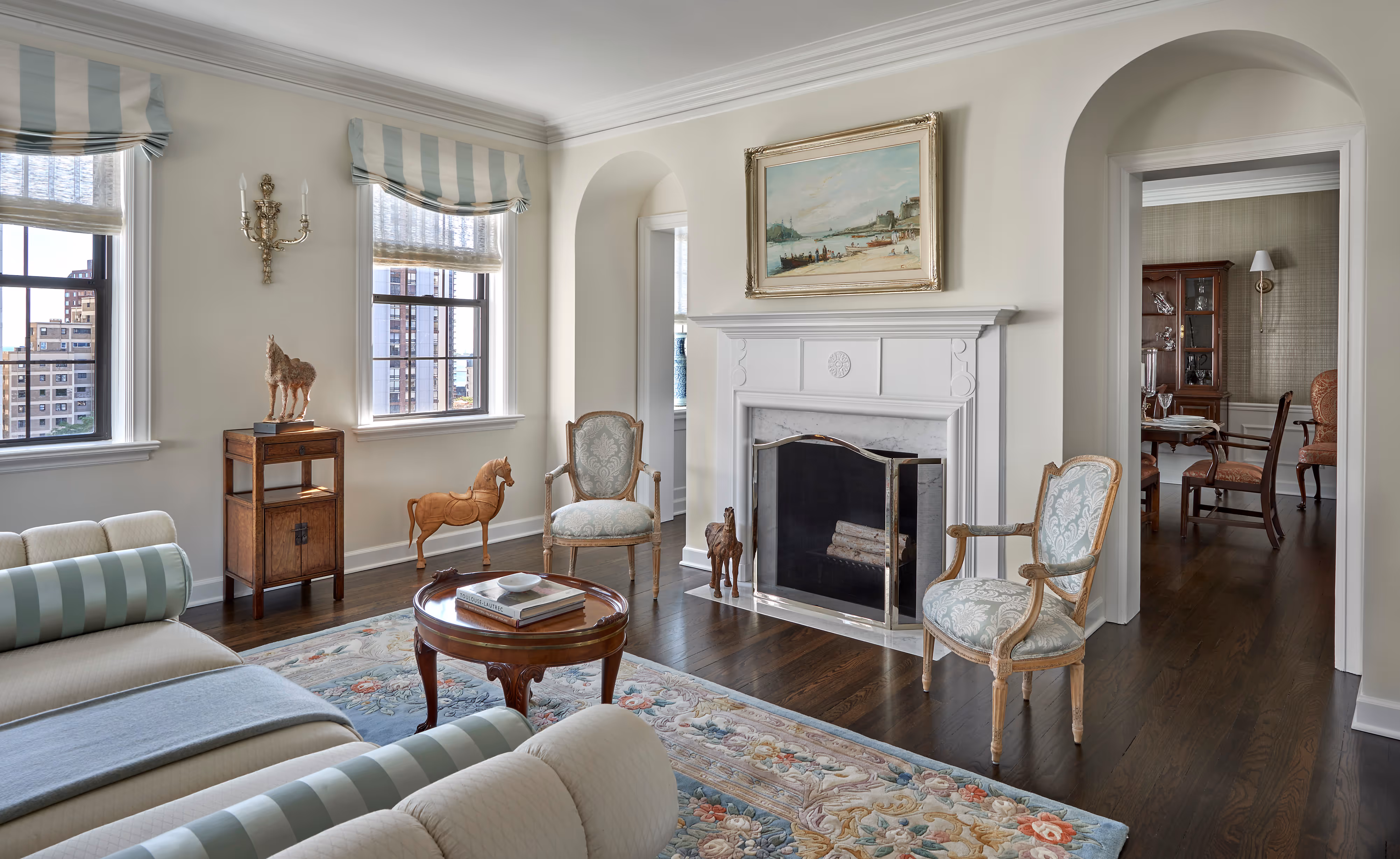 Modern furnishings are gently softened to coexist with treasured vintage pieces, while custom-designed elements in dark walnut and silver leaf introduce depth and quiet drama. Curvilinear forms and layered textures further enrich the spaces. Lauren, who designed many of the furnishings and window treatments, drew inspiration from the client’s love of traditional, nuanced color palettes-along with her personal passions, including a fondness for birds and a remarkable collection of vintage Tang Dynasty horses.