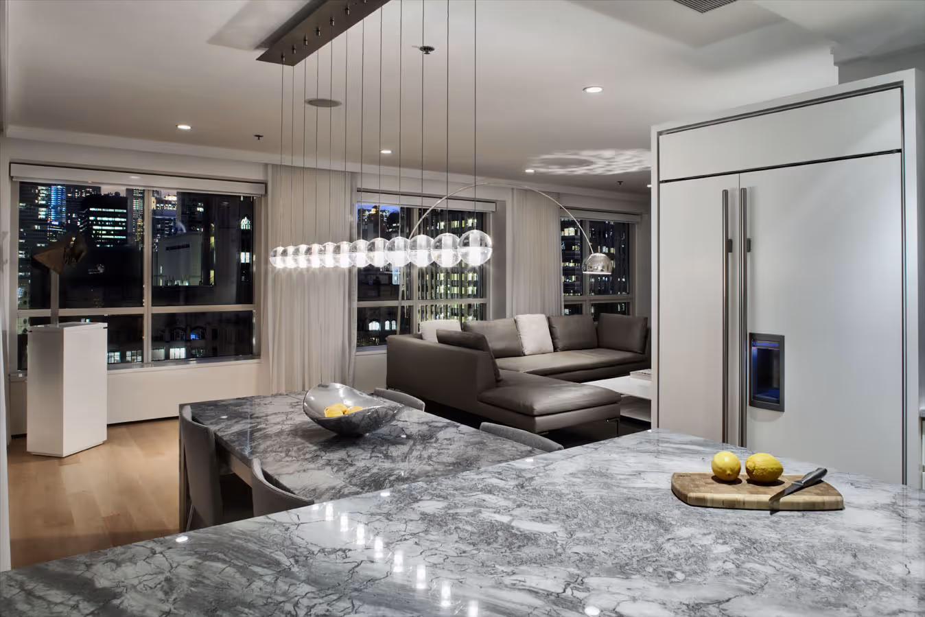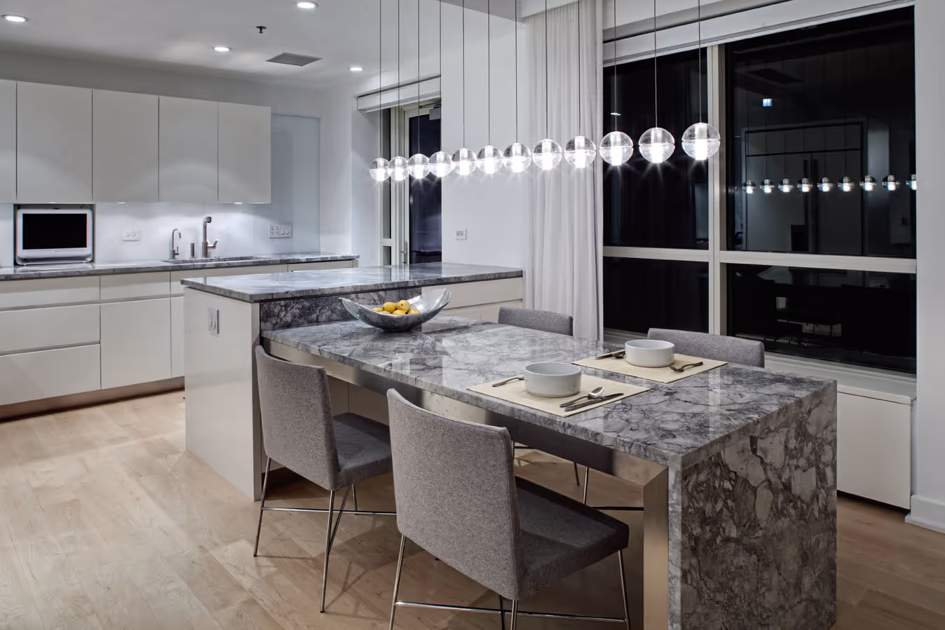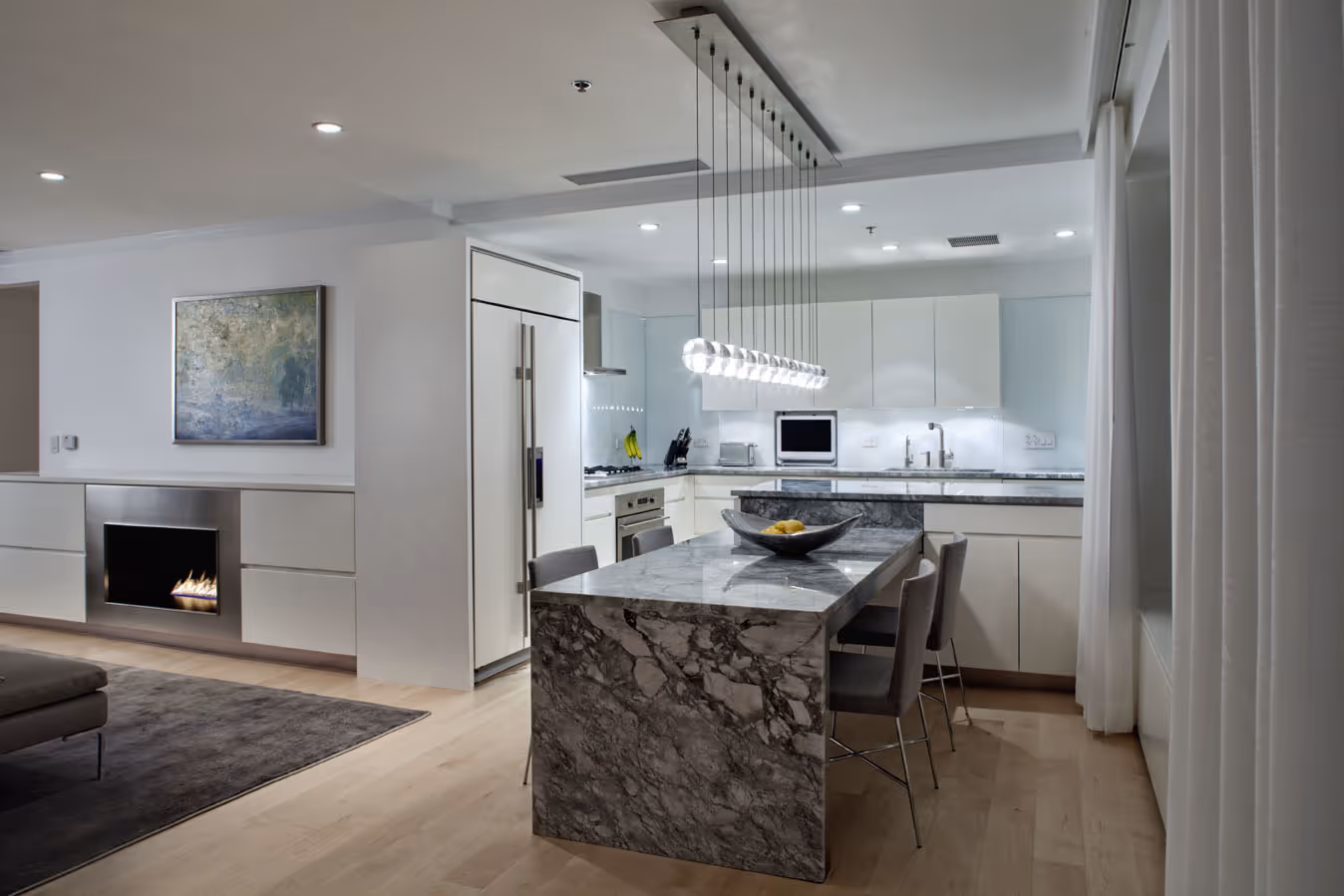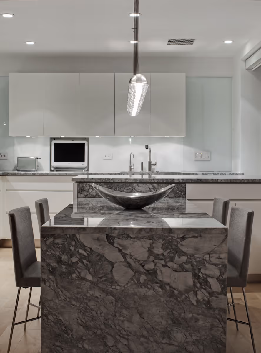 The kitchen was meticulously tailored to optimize both form and function, featuring quartzite countertops chosen for their marble-like beauty and enduring practicality. These counters extend gracefully into the dining area, creating a seamless flow between spaces.