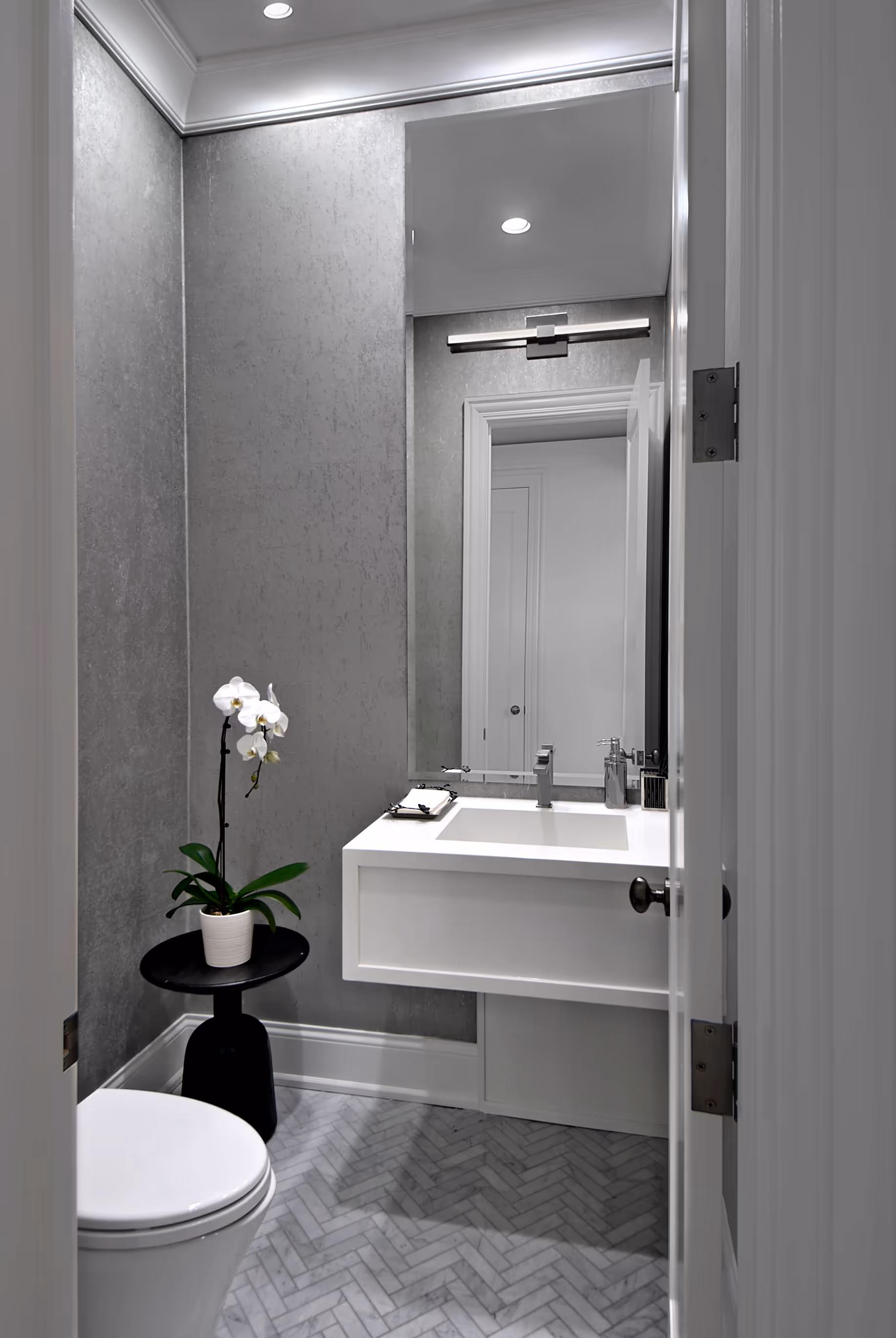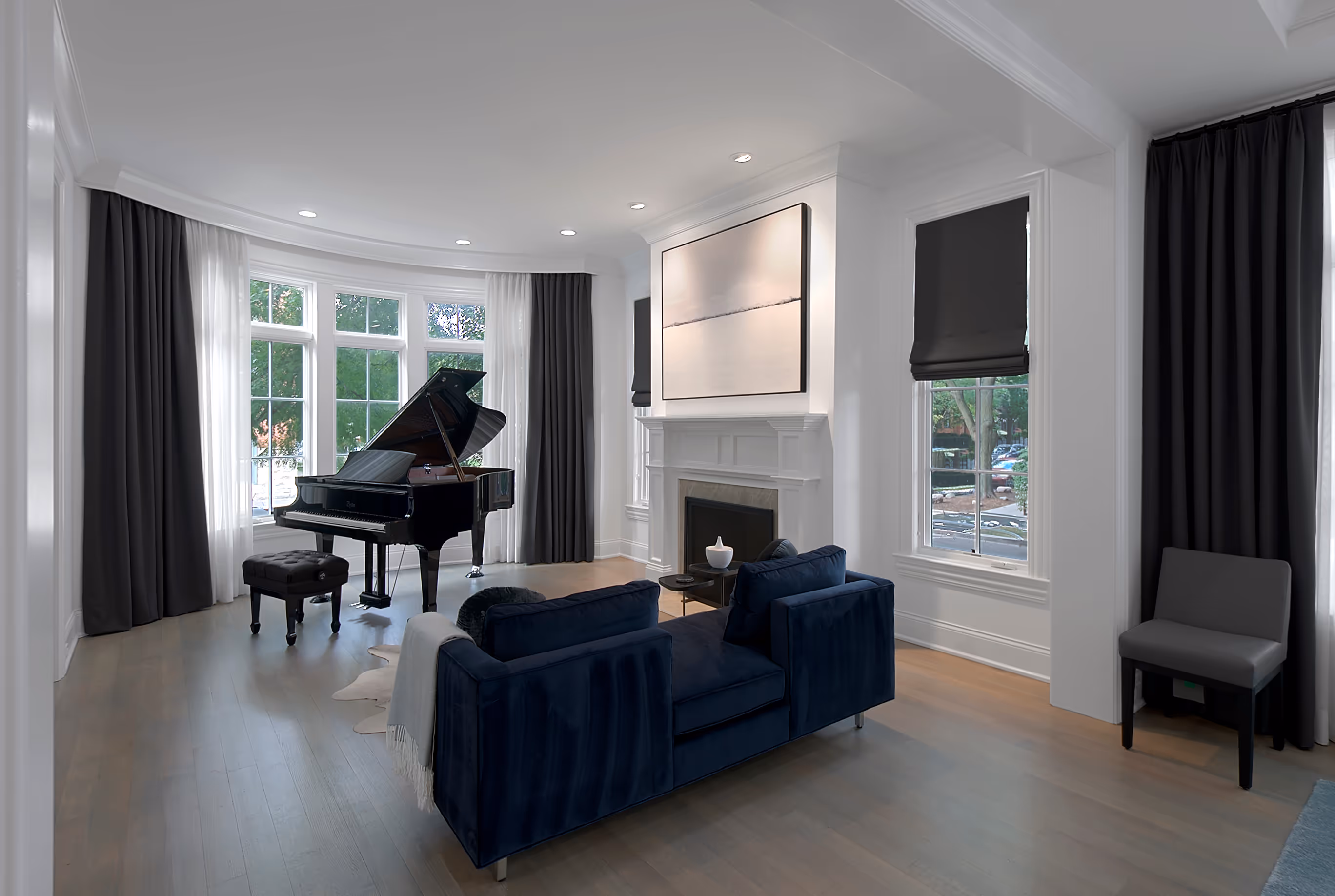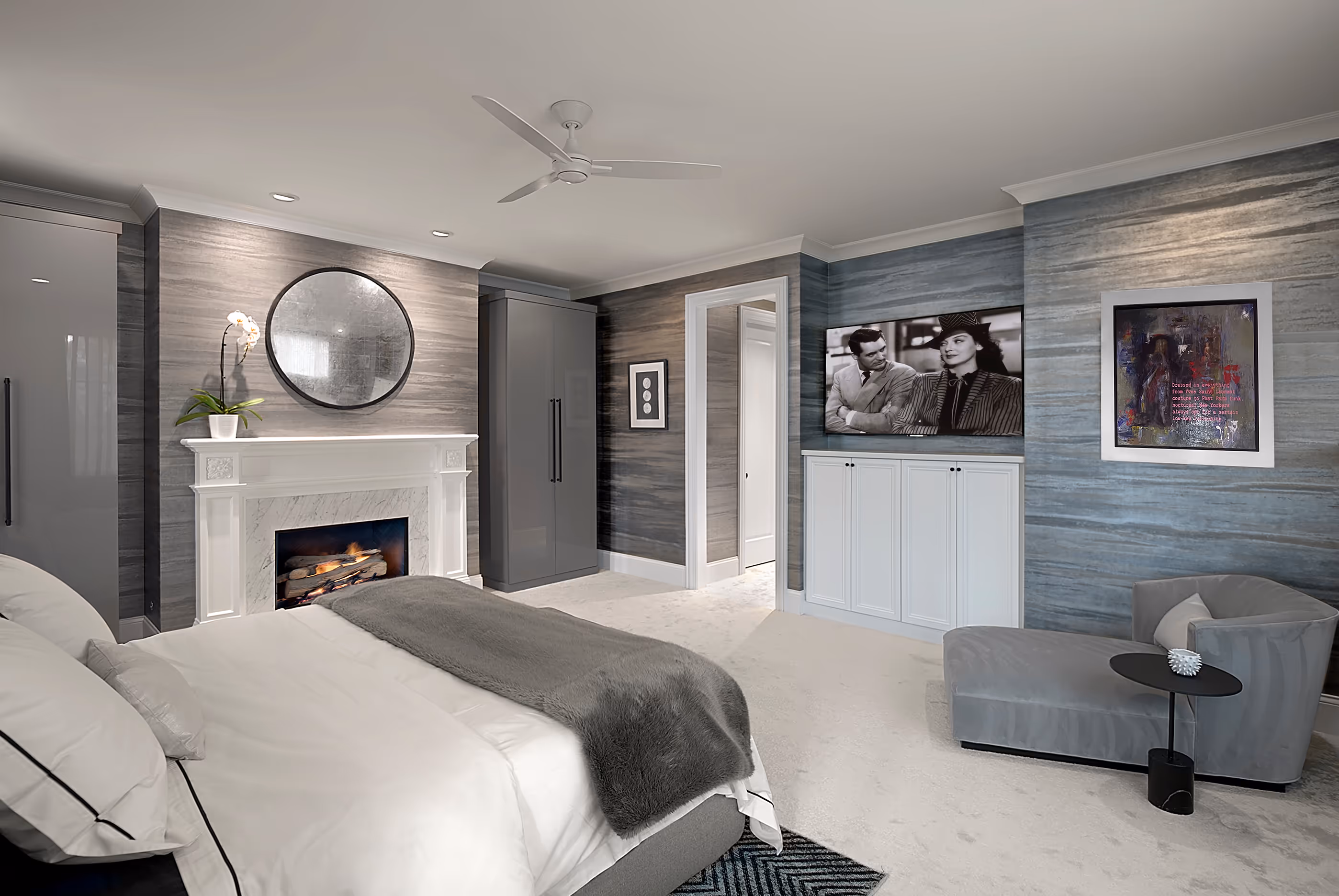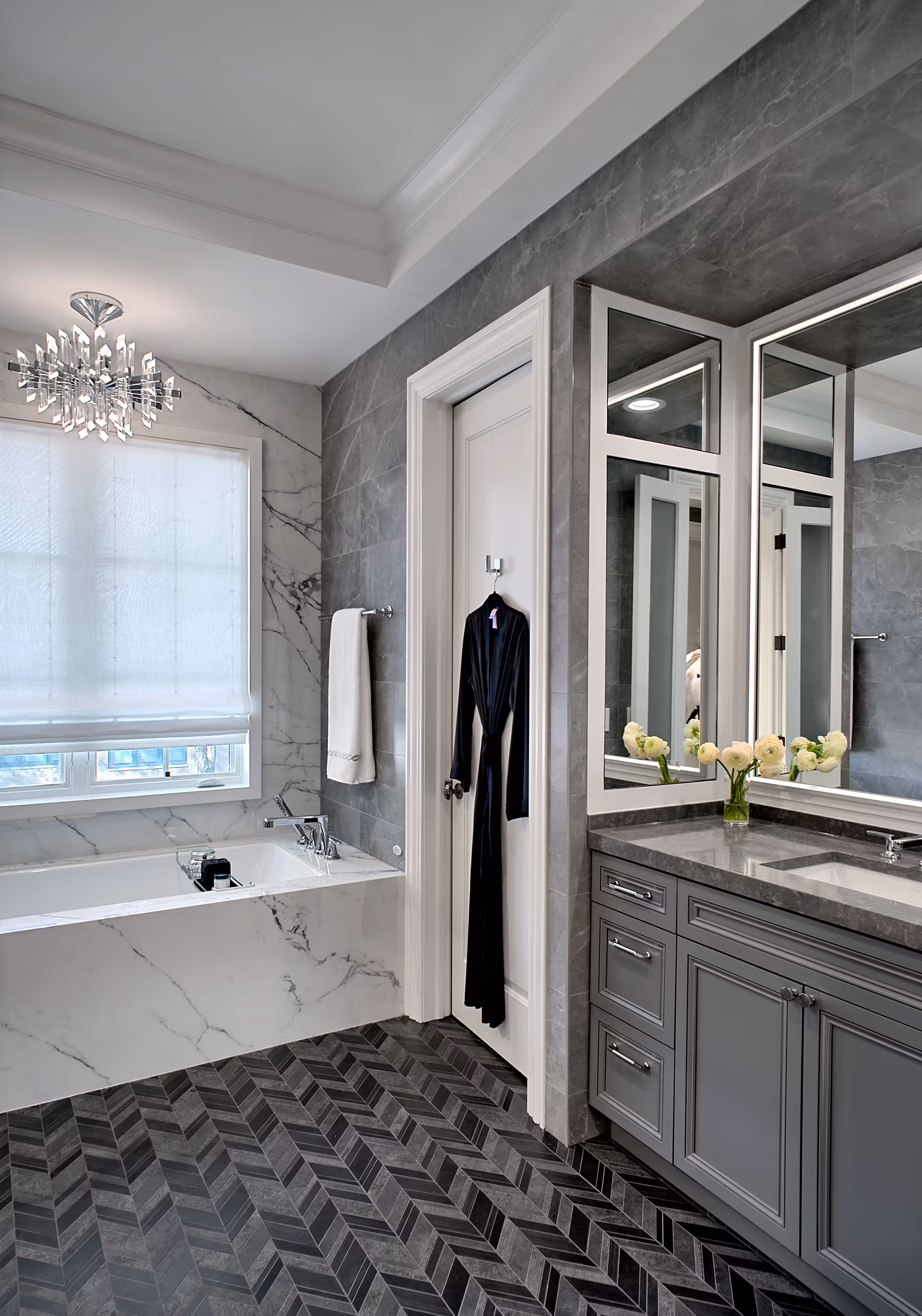 The project entailed a comprehensive renovation of their Lincoln Park residence- a magical transformation. From the floors, which were carefully sanded and stained, to the freshly painted and thoughtfully furnished rooms. The kitchen, family room, primary suite, and primary bath were all reimagined with a sleek, modern and elegant sensibility incorporating a moody palette of smoky grays and cool blues to set the tone. And then, the kitchen’s high-gloss Italian lacquered cabinetry adds a layer of luxurious opulence to the home’s modern feel.