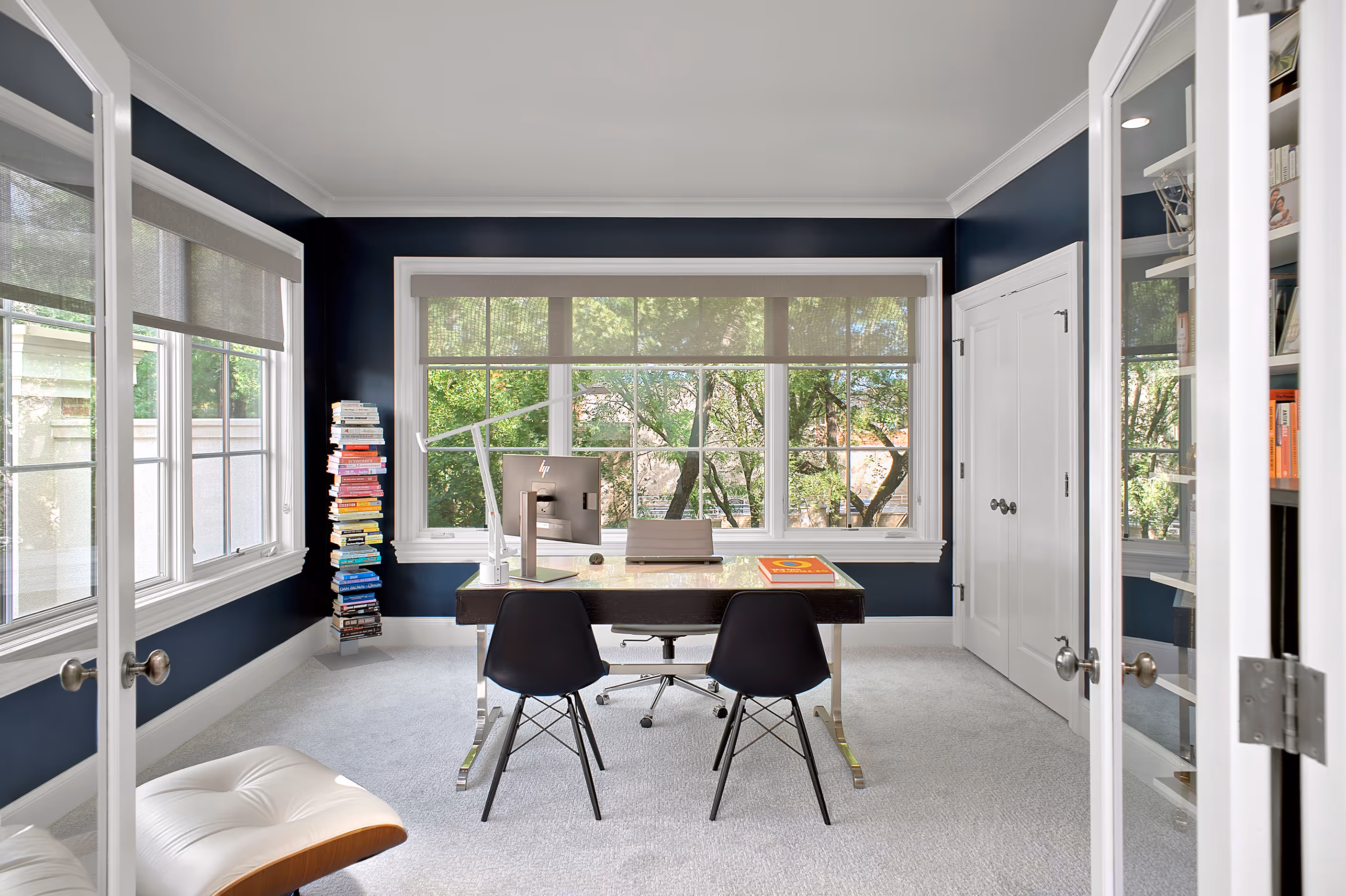 The interplay between the smoky hues and the home's abundant natural light results in a quietly dramatic and visually compelling atmosphere.