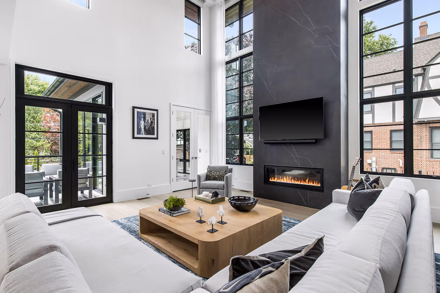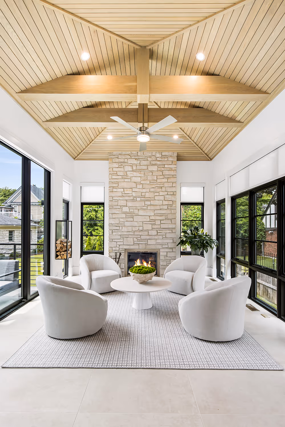 Among the many bespoke elements, the custom sculptural staircase, designed by myself and my team, stands out as a true centerpiece—equal parts function and art. Other highlights include a dramatic floor-to-ceiling fireplace, a stunning glass-enclosed office, and a four-season room that invites the outdoors inside year-round while creating the perfect backdrop for family time and the making of memories that will last a lifetime.