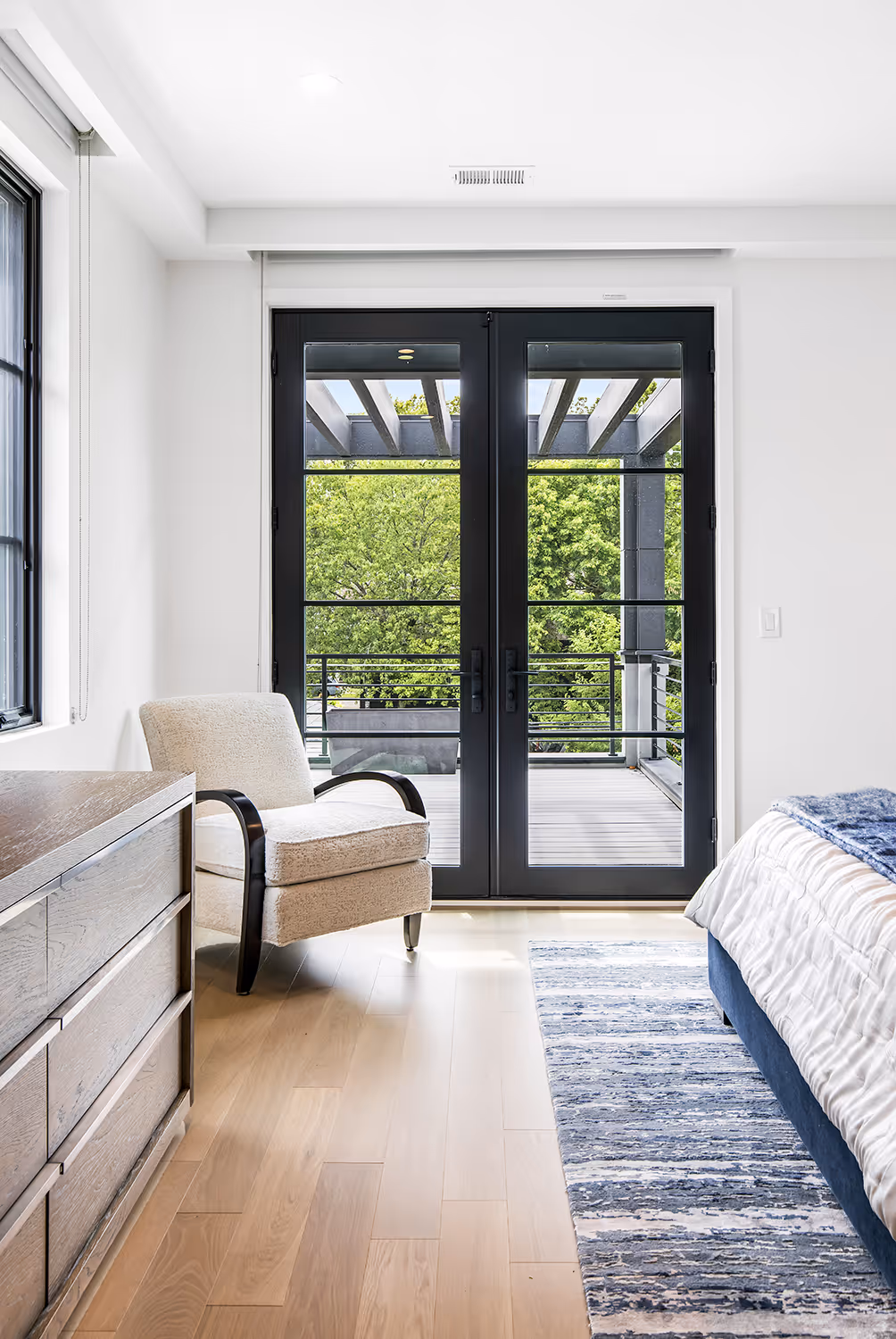 The interiors reflect a curated balance of sleek sophistication and warm livability. In the kitchen, custom cabinetry painted in a serene nautical blue pays homage to the family’s sailing roots—a subtle yet striking statement that plays beautifully against the light white oak flooring and clean, sleek architectural lines throughout the home.