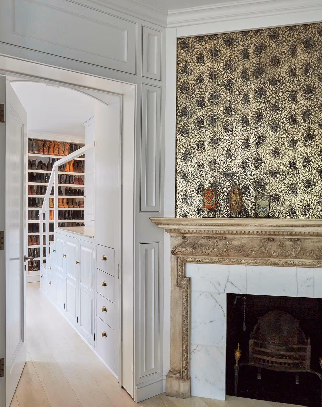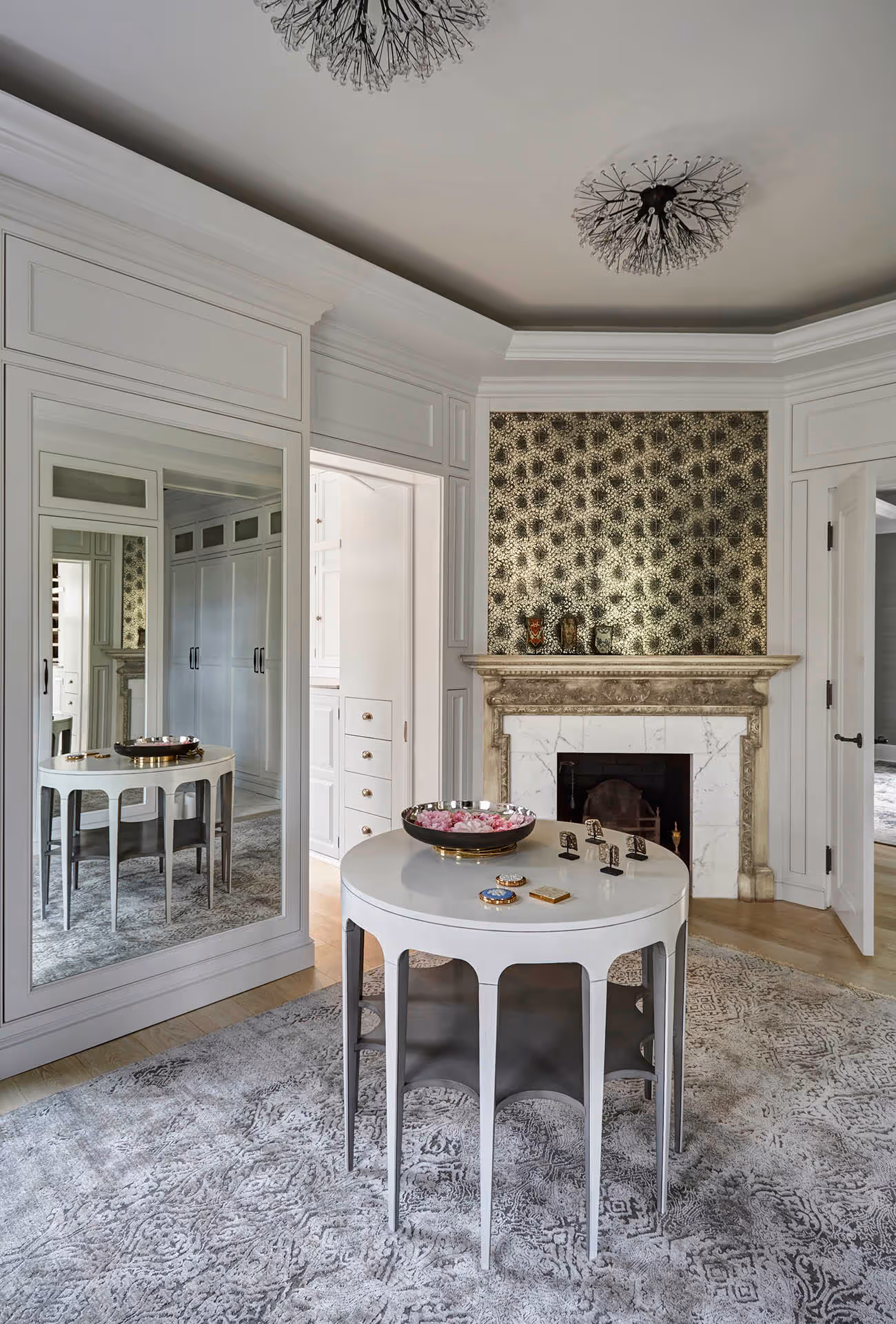 Thoughtful luxuries abound—from a hidden mirror-integrated television to marble inlay flooring that flows seamlessly into the lady of the house’s bespoke dressing suite. There, custom cabinetry was meticulously designed to showcase her extensive collection of jewelry, couture, and footwear—transforming functionality into pure luxury.