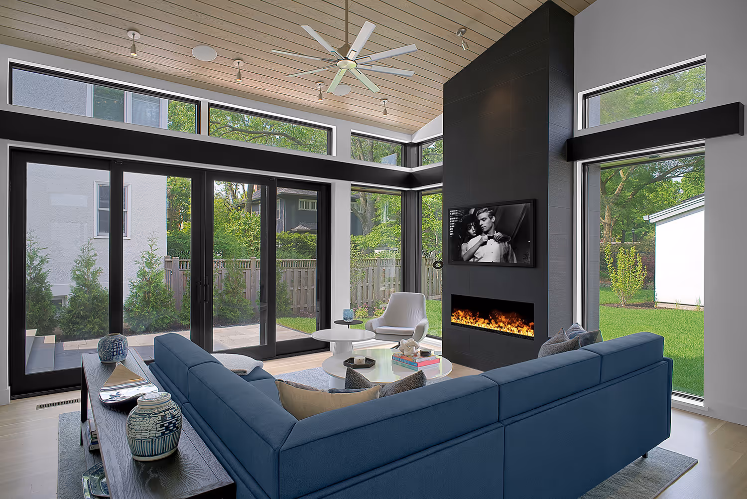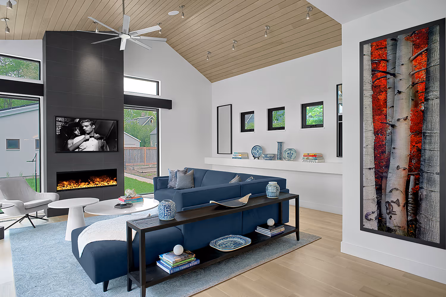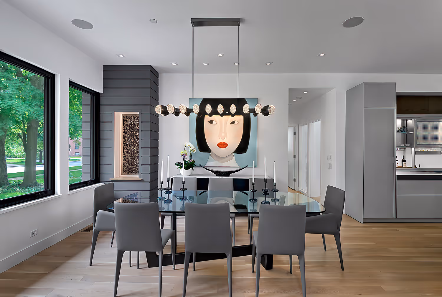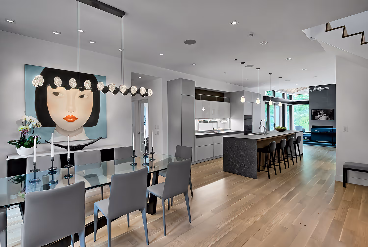 Every finish and feature were chosen with care- sustainability always top of mind- but without compromising luxury or design integrity. Highlights include Valcucine kitchen cabinetry crafted from recycled materials, a vapor fireplace, exterior siding made from coal fly-ash waste, sustainably harvested wood flooring, and a roof composed of recycled metal. Passive elements—such as a carefully engineered light shelf in the family room—work to naturally illuminate and regulate the interior, significantly reducing energy demand.