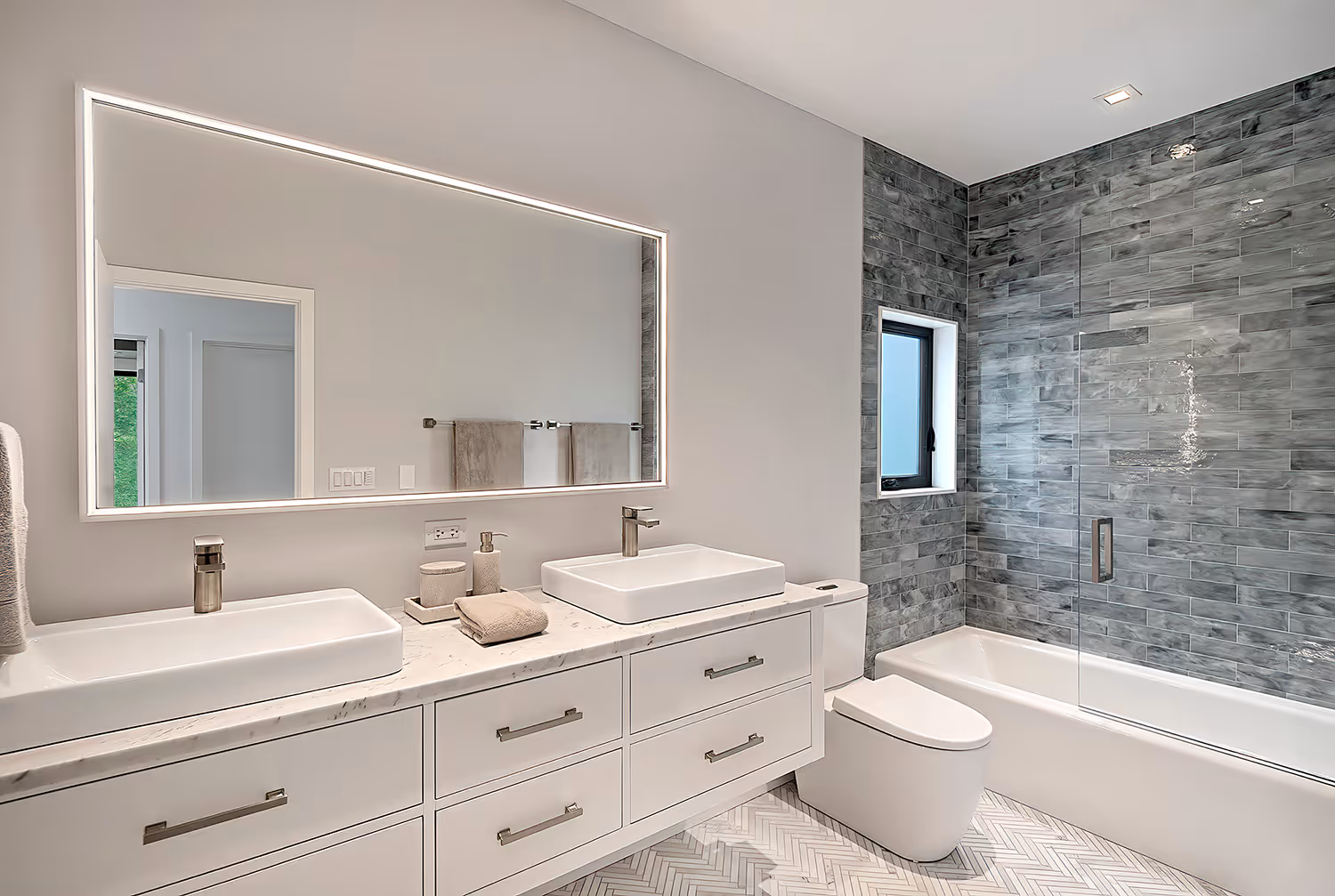 Throughout, we emphasized natural, non-toxic materials and locally sourced, storied pieces—including a vintage Asian screen custom-fitted within an LED-lit niche to serve as a striking focal point. We intentionally avoided conventional wallcoverings due to harmful adhesives and opted for a selected recycled tile for its durability, texture, and environmental responsibility.