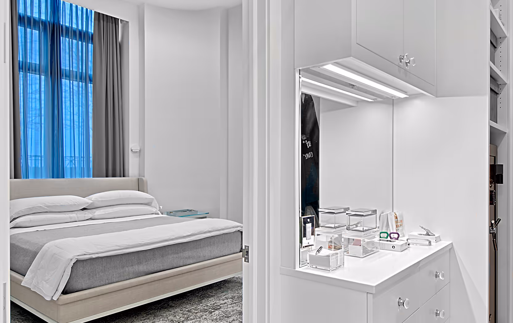 The kitchen was meticulously designed to optimize the apartment’s unique architectural footprint, offering ample storage and functionality for entertaining, all while maintaining a crisp, sculptural aesthetic.