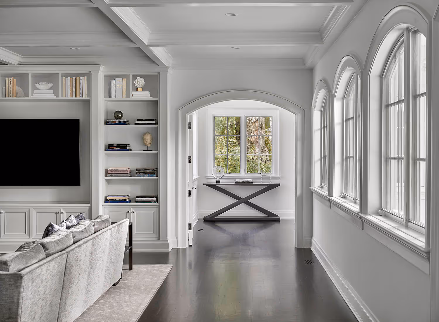 To complement the grand scale of the home, generously proportioned moldings were designed to bring balance and visual drama. Thoughtfully placed custom furniture pieces offer inviting spaces to lounge, gather, and unwind—blending sophistication with the effortless comfort of family living.